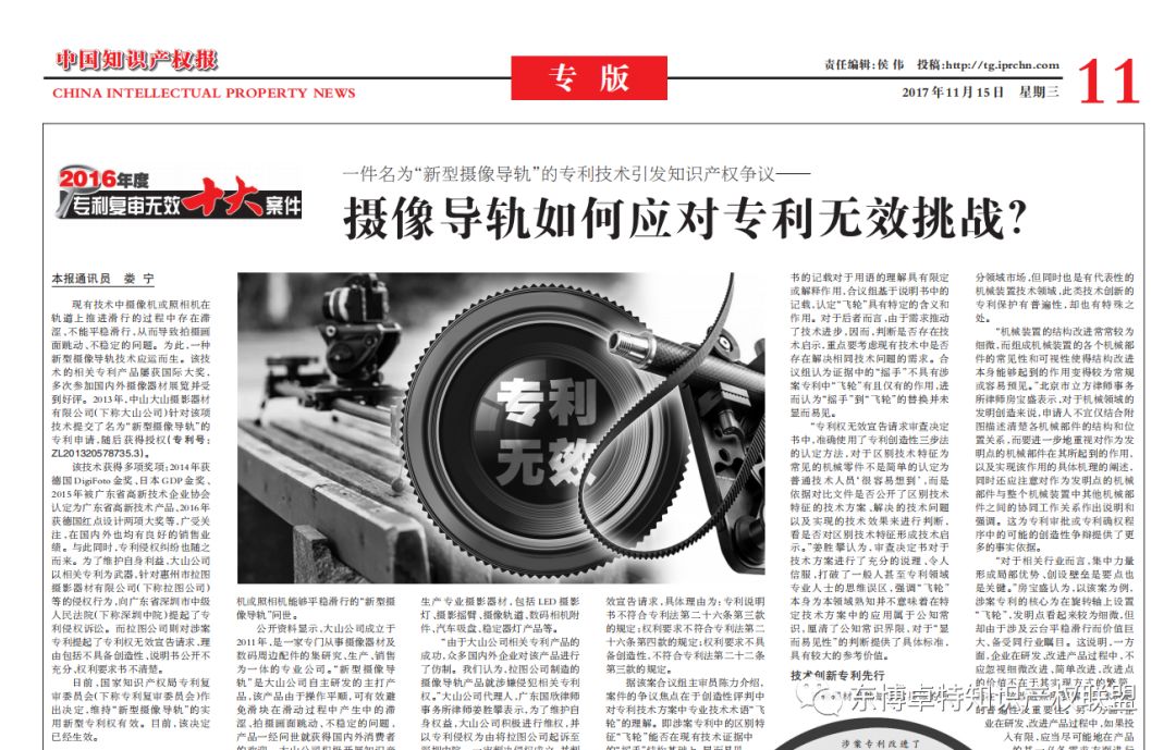 单说专利复审委员会这边,惠州市拉图摄影器材有限公司(下称拉图公司)于2016年3月2日向专利复审委员会提起了无效宣告请求,而该年8月23日专利复审委员会作出审查决定,判决维持专利权有效。该次无效被国家知识产权局评为2016年度专利复审无效十大案件之一。专利复审委员会对该案件的点评如下:名称为“新型摄像导轨”的实用新型专利无效宣告请求案,该专利改进了大型摄像机的摄像导轨,曾获多个国际奖项;审查决定诠释了权利要求中技术术语的解释原则;审查结论是维持专利权有效。该案件获得多方关注,各大门户网站以及政府网站如人民网都有转载。中国知识产权报还进行了专版分析报道。